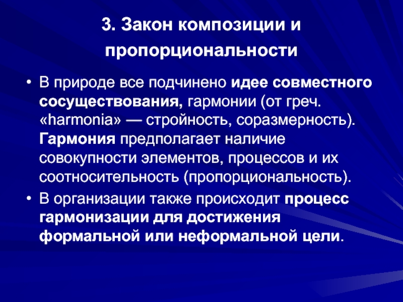сосуществования, гармонии (от греч. «harmonia» — стройность, соразмерность). Гармония предполагает наличие совокупности элементов, процессов и их соотносительность (пропорциональность).