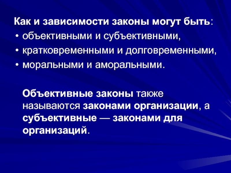Объективные законы также называются законами организации, а субъективные — законами для организаций.