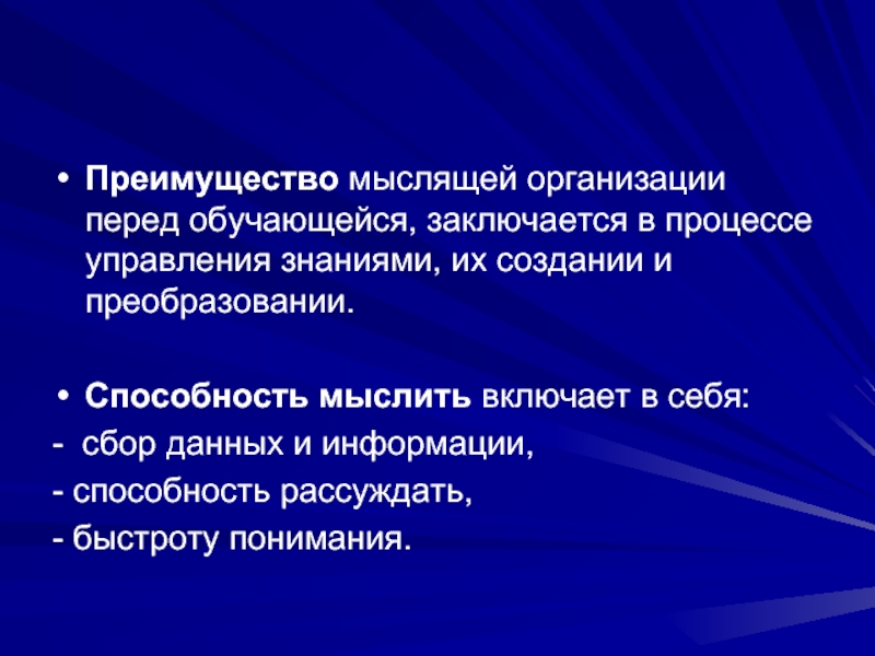 Слайд 54Преимущество мыслящей организации перед обучающейся, заключается в процессе управления знаниями, их