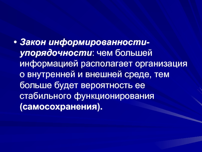 Слайд 47Закон информированности-упорядочности: чем большей информацией располагает организация о внутренней и внешней