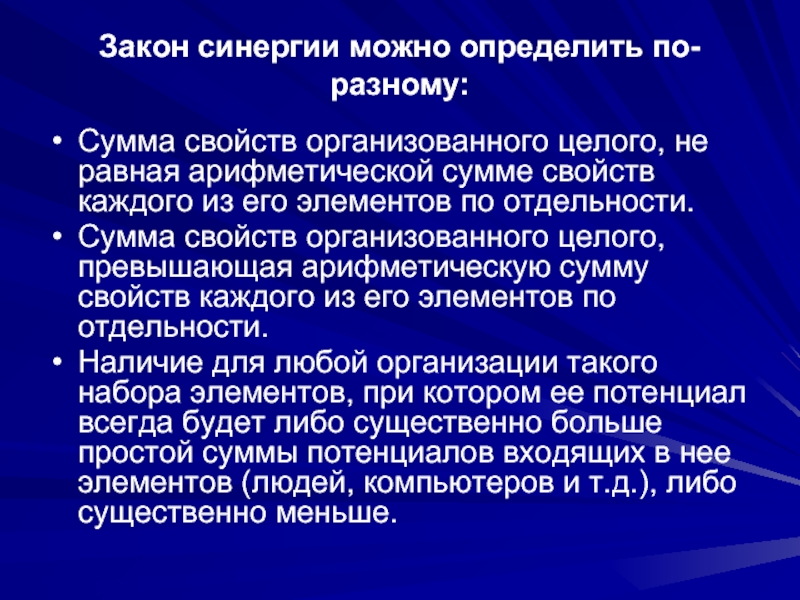 Слайд 17Закон синергии можно определить по-разному: