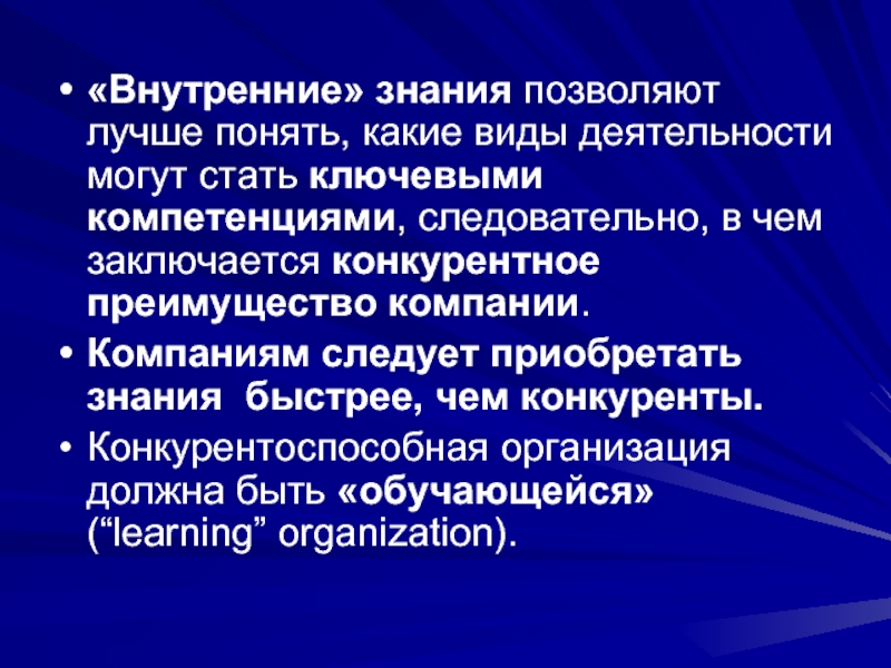 Слайд 50Знания нужны организациям для развития ключевых компетенций, которые характеризовались бы длительным