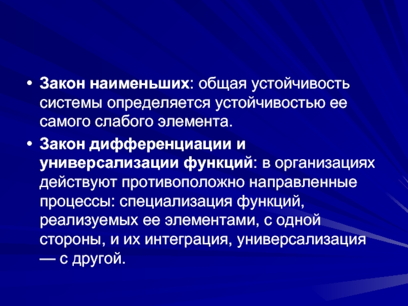 Закон дифференциации и универсализации функций: в организациях действуют противоположно направленные процессы: специализация функций, реализуемых ее элементами, с одной стороны, и их интеграция, универсализация — с другой.