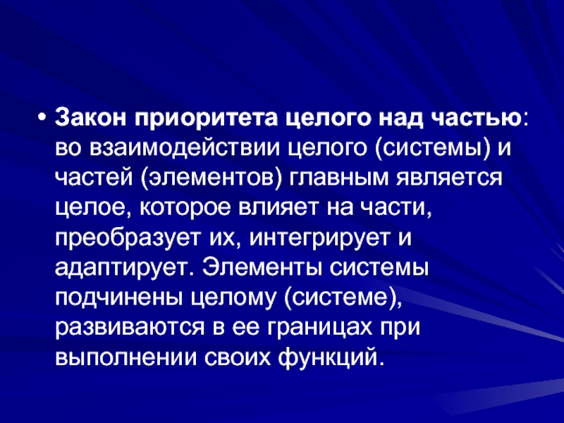 Слайд 68Закон приоритета целого над частью: во взаимодействии целого (системы) и частей