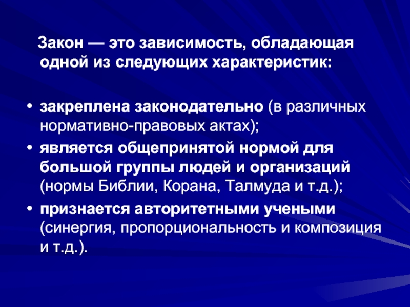 Слайд 8  Закон — это зависимость, обладающая одной из следующих характеристик: