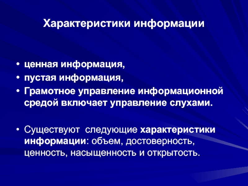 Существуют следующие характеристики информации: объем, достоверность, ценность, насыщенность и открытость.