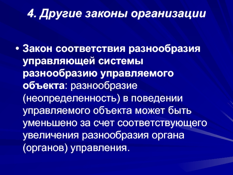 разнообразие (неопределенность) в поведении управляемого объекта может быть уменьшено за счет соответствующего увеличения разнообразия органа (органов) управления.