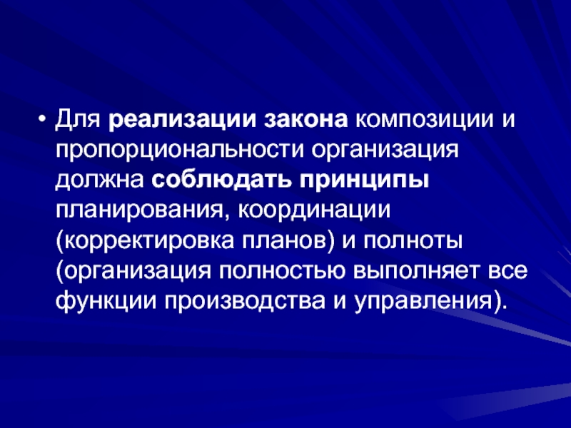 Слайд 66Для реализации закона композиции и пропорциональности организация должна соблюдать принципы планирования,