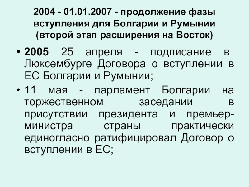 Слайд 412004 - 01.01.2007 - продолжение фазы вступления для Болгарии и Румынии