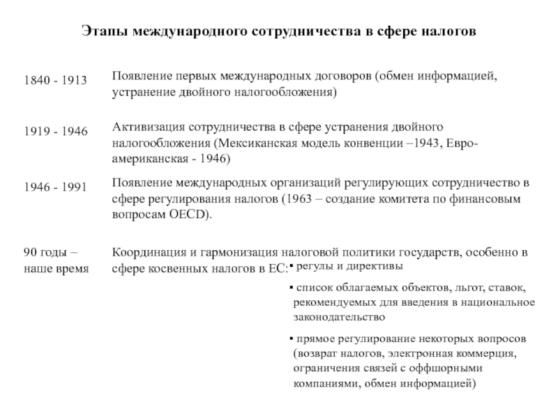 Появление международных организаций регулирующих сотрудничество в сфере регулирования налогов (1963 – создание комитета по финансовым вопросам OECD).