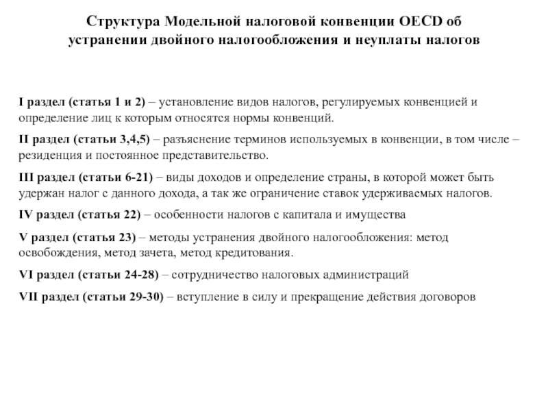 V раздел (статья 23) – методы устранения двойного налогообложения: метод освобождения, метод зачета, метод кредитования.