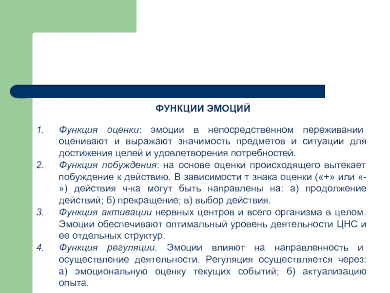 Функция регуляции. Эмоции влияют на направленность и осуществление деятельности. Регуляция осуществляется через: а) эмоциональную оценку текущих событий; б) актуализацию опыта.