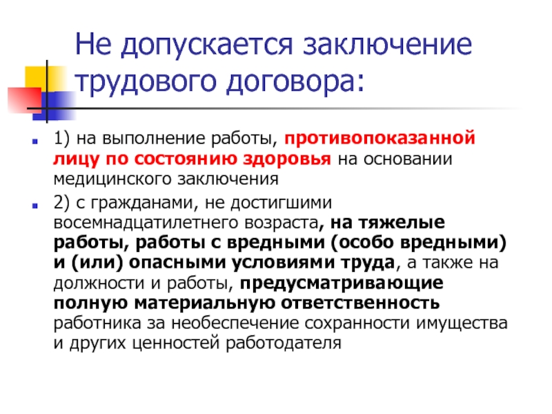 Слайд 3Не допускается заключение трудового договора: