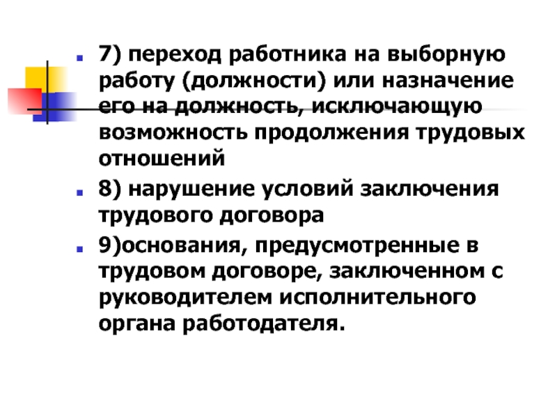 7) переход работника на выборную работу (должности) или назначение его на