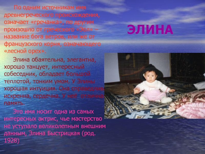 Элина обаятельна, элегантна, хорошо танцует, интересный собеседник, обладает большой теплотой, тонким умом. У Элины хорошая интуиция. Она справедлива, искренна, сердечна. У неё отличная память.