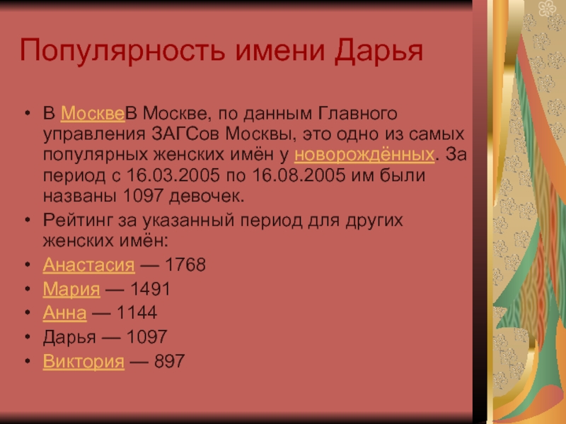 это одно из самых популярных женских имён у новорождённых. За период с 16.03.2005 по 16.08.2005 им были названы 1097 девочек.