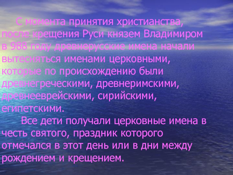 Владимиром в 988 году древнерусские имена начали вытесняться именами церковными, которые по происхождению были древнегреческими, древнеримскими, древнееврейскими, сирийскими, египетскими.