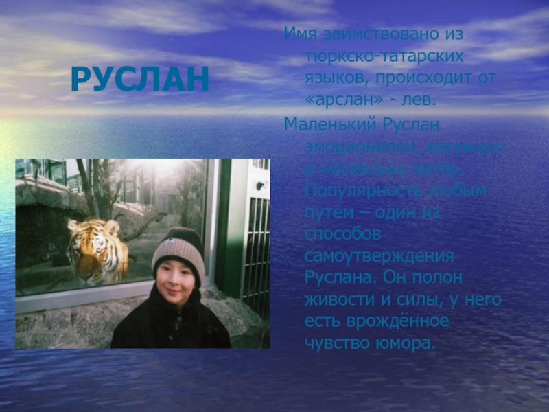 эмоционален, капризен и несколько хитёр. Популярность любым путём – один из способов самоутверждения Руслана. Он полон живости и силы, у него есть врождённое чувство юмора.