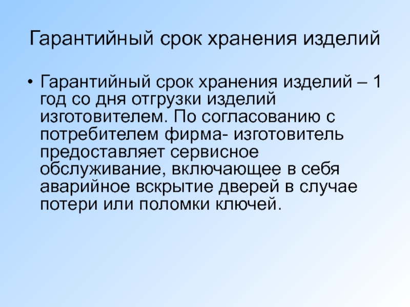дня отгрузки изделий изготовителем. По согласованию с потребителем фирма- изготовитель предоставляет сервисное обслуживание, включающее в себя аварийное вскрытие дверей в случае потери или поломки ключей.