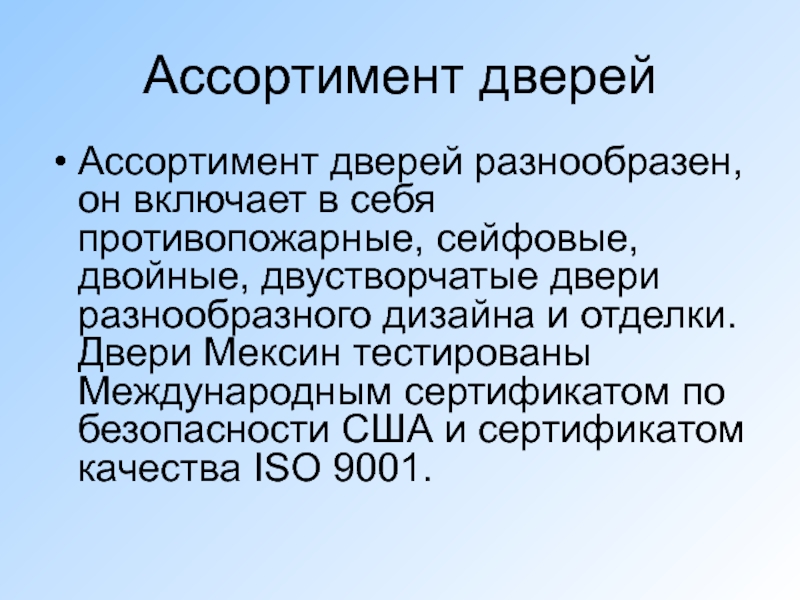 Ассортимент дверей разнообразен, он включает в себя противопожарные, сейфовые, двойные,