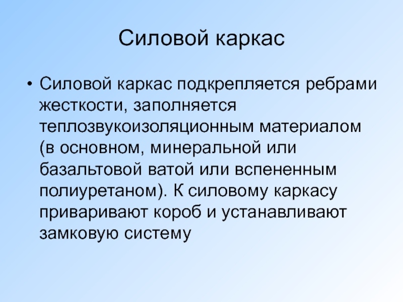 Силовой каркас подкрепляется ребрами жесткости, заполняется теплозвукоизоляционным материалом (в основном,