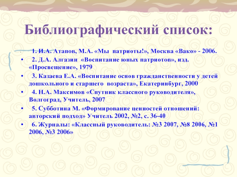 1. И.А. Атапов, М.А. «Мы патриоты!», Москва «Вако» - 2006.