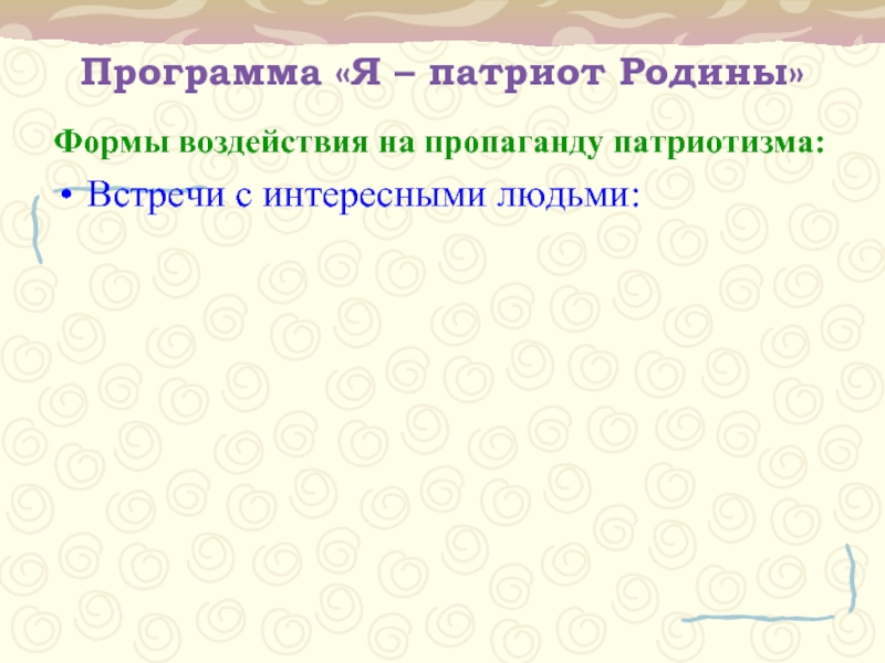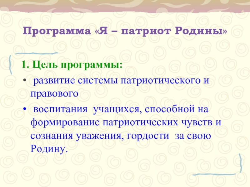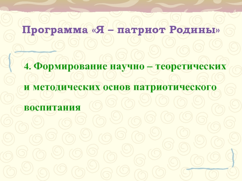формирование комплекса нормативного, правового и организационно-методического обеспечения функционирования системы патриотического воспитания.