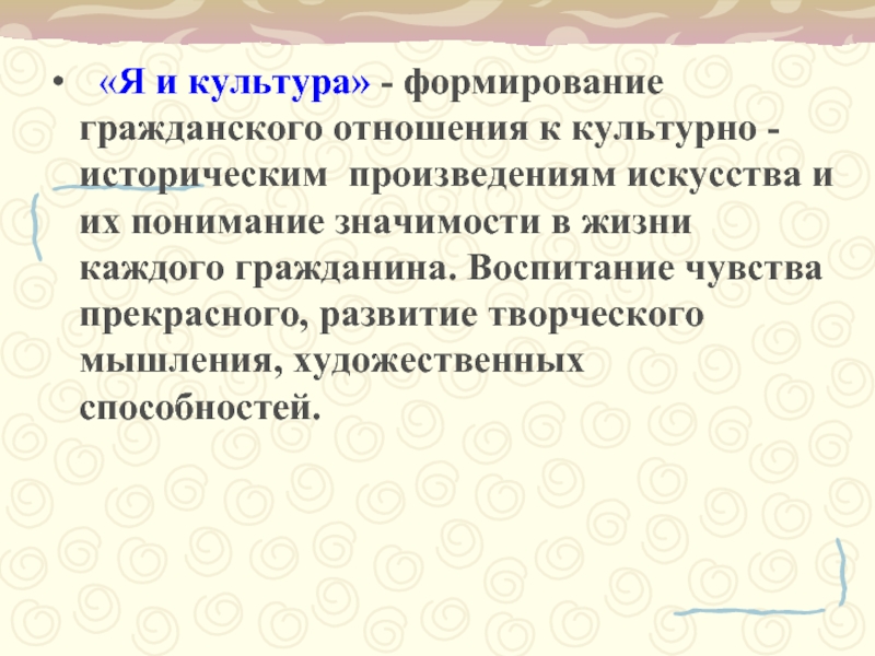 Слайд 10 «Я и культура» - формирование гражданского отношения к культурно -