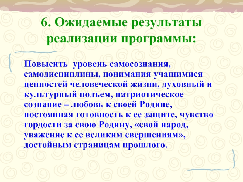 учащимися ценностей человеческой жизни, духовный и культурный подъем, патриотическое сознание – любовь к своей Родине, постоянная готовность к ее защите, чувство гордости за свою Родину, «свой народ, уважение к ее великим свершениям», достойным страницам прошлого.