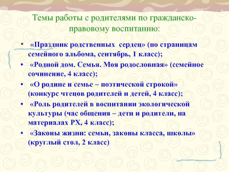 Слайд 14Темы работы с родителями по гражданско-правовому воспитанию: