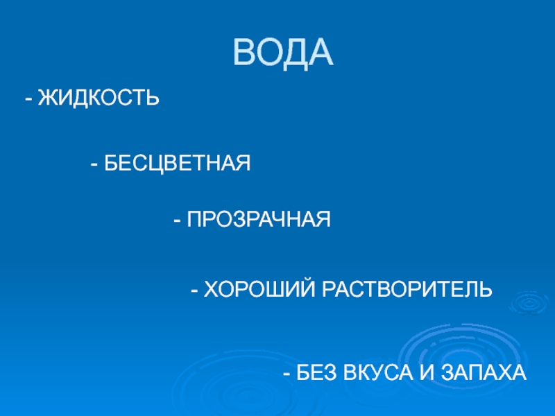 Тема: Какая бывает вода ? ВОДА - ЖИДКОСТЬ - БЕСЦВЕТНАЯ - ПРОЗРАЧНАЯ - ХОРОШИЙ РАСТВОРИТЕЛЬ - БЕЗ ВКУСА И ЗАПАХА. презентация