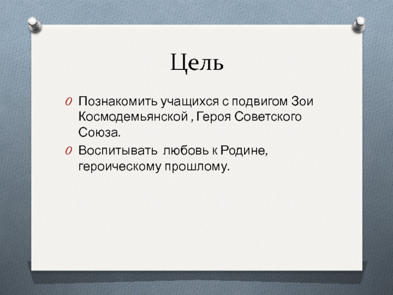 Познакомить учащихся с подвигом Зои Космодемьянской , Героя Советского Союза.