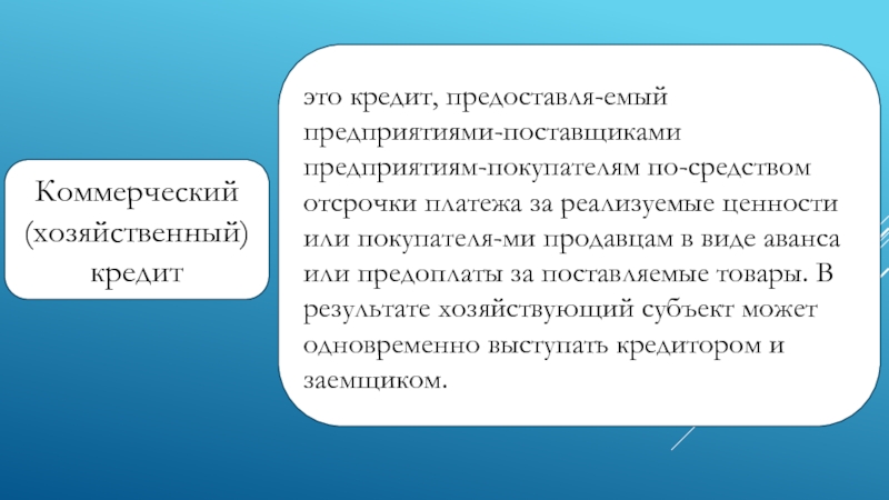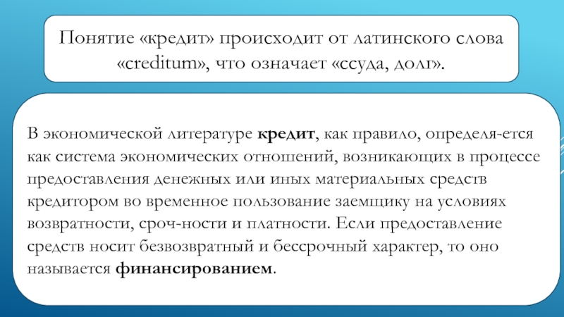 В экономической литературе кредит, как правило, определяется как система экономических отношений, возникающих в процессе предоставления денежных или иных материальных средств кредитором во временное пользование заемщику на условиях возвратности, срочности и платности. Если предоставление средств носит безвозвратный и бессрочный характер, то оно называется финансированием.