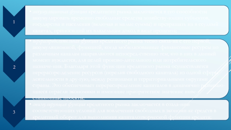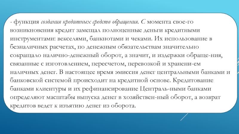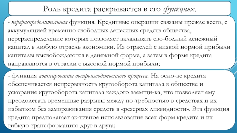 - функция авансирования воспроизводственного процесса. На основе кредита обеспечивается непрерывность кругооборота капитала в обществе и ускорение кругооборота капитала каждого заемщика, что позволяет ему преодолевать временные разрывы между потребностью в средствах и их избытком без замораживания средств в «резервах ликвидности». Эта функция кредита предполагает активное использование всех форм кредита и их гибкую трансформацию друг в друга;