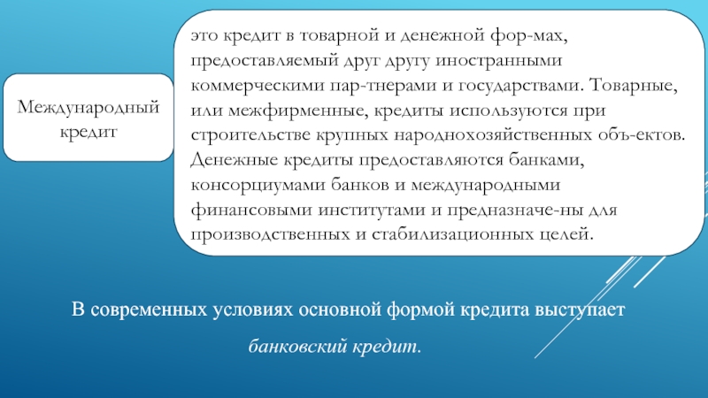 В зависимости от того, кто является кредитором в сделке, выделяют основные формы кредита, коммерческий (хозяйственный), банковский, потребительский, государственный и международный кредит.