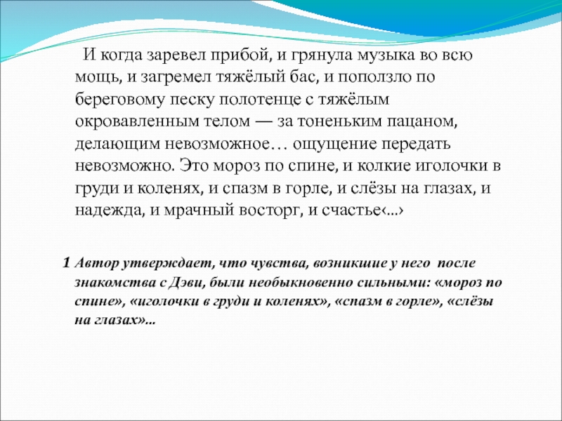 1 Автор утверждает, что чувства, возникшие у него после знакомства с Дэви, были необыкновенно сильными: «мороз по спине», «иголочки в груди и коленях», «спазм в горле», «слёзы на глазах»...