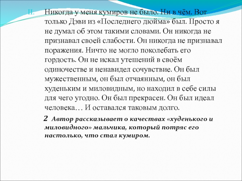 2 Автор рассказывает о качествах «худенького и миловидного» мальчика, который потряс его настолько, что стал кумиром.