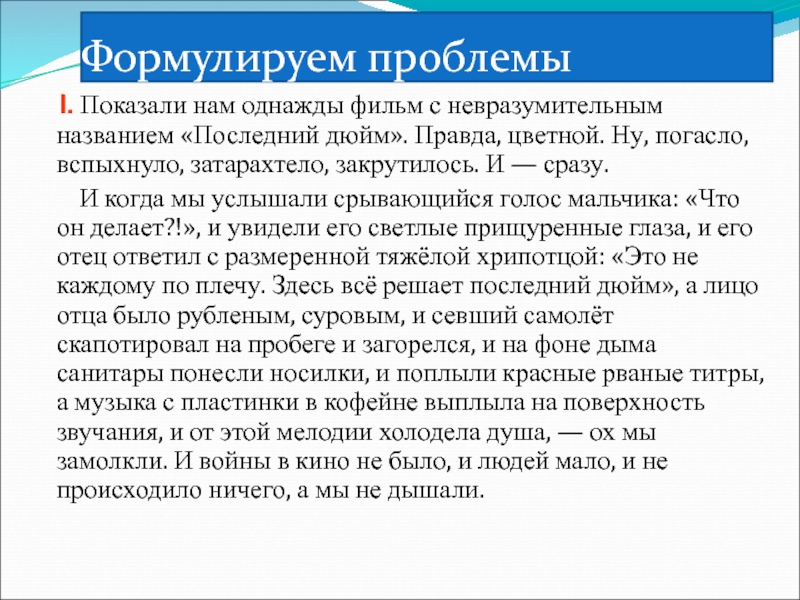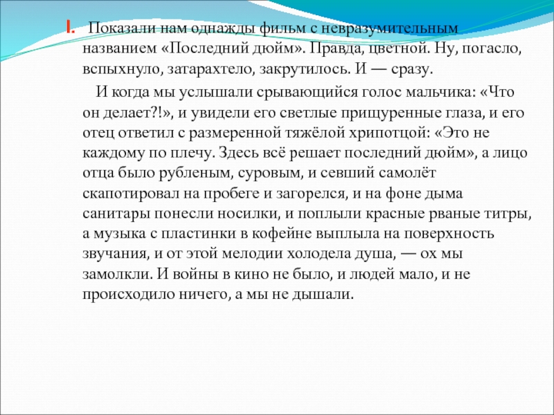 Слайд 13I. Показали нам однажды фильм с невразумительным названием «Последний дюйм».