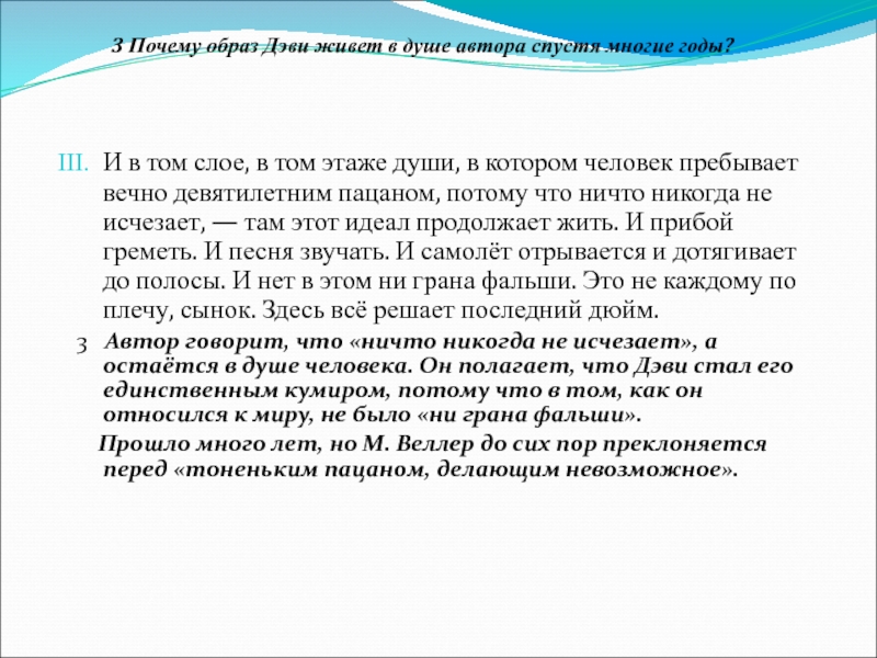 3 Автор говорит, что «ничто никогда не исчезает», а остаётся в душе человека. Он полагает, что Дэви стал его единственным кумиром, потому что в том, как он относился к миру, не было «ни грана фальши».