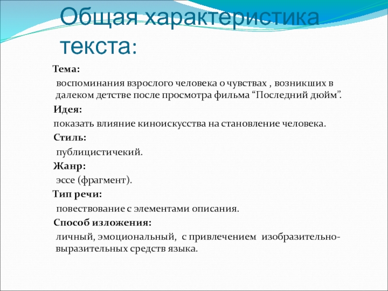 Слайд 5Общая характеристика текста: