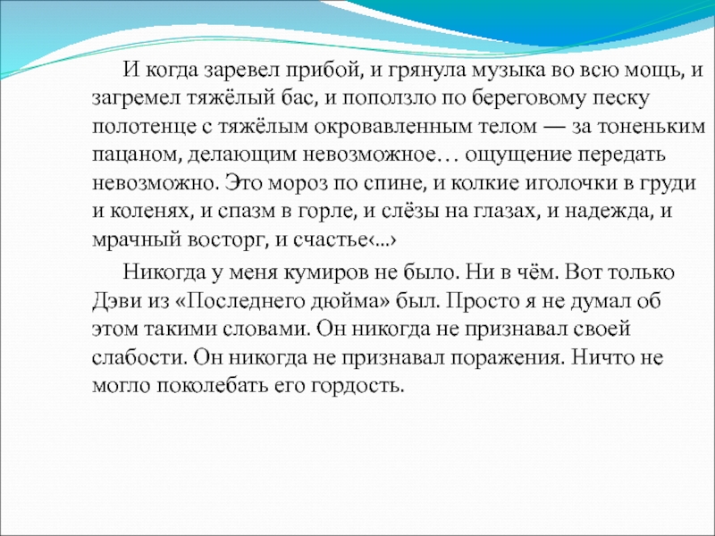 музыка во всю мощь, и загремел тяжёлый бас, и поползло по береговому песку полотенце с тяжёлым окровавленным телом — за тоненьким пацаном, делающим невозможное… ощущение передать невозможно. Это мороз по спине, и колкие иголочки в груди и коленях, и спазм в горле, и слёзы на глазах, и надежда, и мрачный восторг, и счастье‹...›