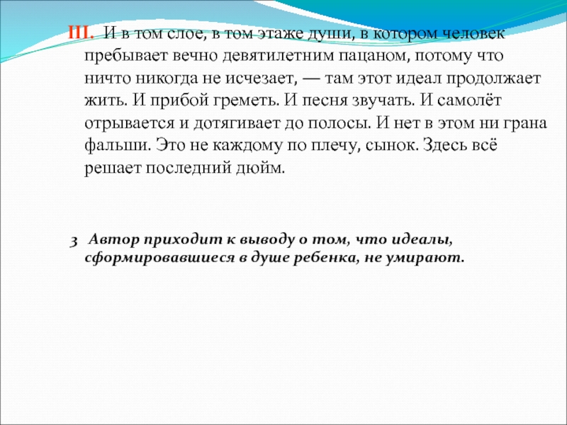 3 Автор приходит к выводу о том, что идеалы, сформировавшиеся в душе ребенка, не умирают.
