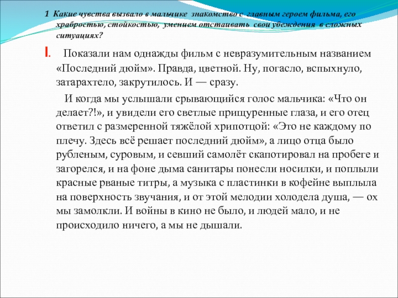 1 Какие чувства вызвало в авторе знакомство с главным героем фильма”Последний дюйм”, его характером?