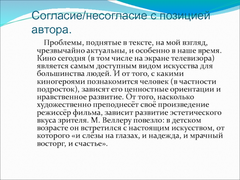 на мой взгляд, чрезвычайно актуальны, и особенно в наше время. Кино сегодня (в том числе на экране телевизора) является самым доступным видом искусства для большинства людей. И от того, с какими киногероями познакомится человек (в частности подросток), зависят его ценностные ориентации и нравственное развитие. От того, насколько художественно преподнесёт своё произведение режиссёр фильма, зависит развитие эстетического вкуса зрителя. М. Веллеру повезло: в детском возрасте он встретился с настоящим искусством, от которого «и слёзы на глазах, и надежда, и мрачный восторг, и счастье».