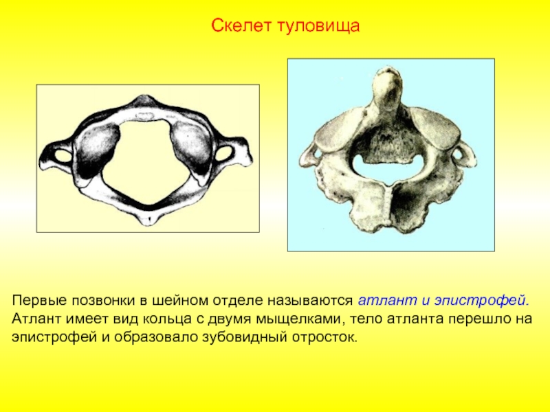 Слайд 14Первые позвонки в шейном отделе называются атлант и эпистрофей. Атлант имеет