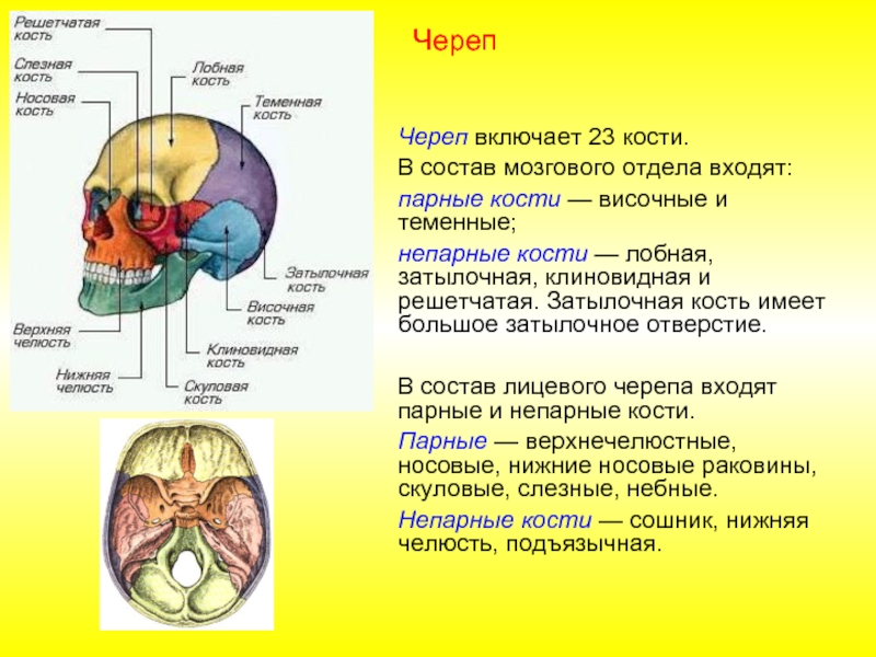 непарные кости — лобная, затылочная, клиновидная и решетчатая. Затылочная кость имеет большое затылочное отверстие.