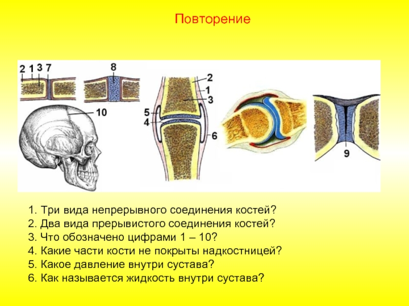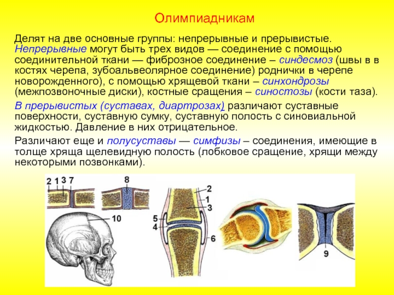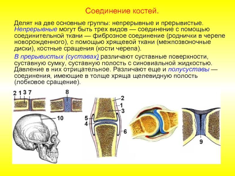 трех видов — соединение с помощью соединительной ткани — фиброзное соединение (роднички в черепе новорожденного), с помощью хрящевой ткани (межпозвоночные диски), костные сращения (кости черепа).