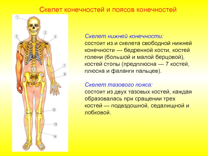 кости, костей голени (большой и малой берцовой), костей стопы (предплюсна — 7 костей, плюсна и фаланги пальцев).