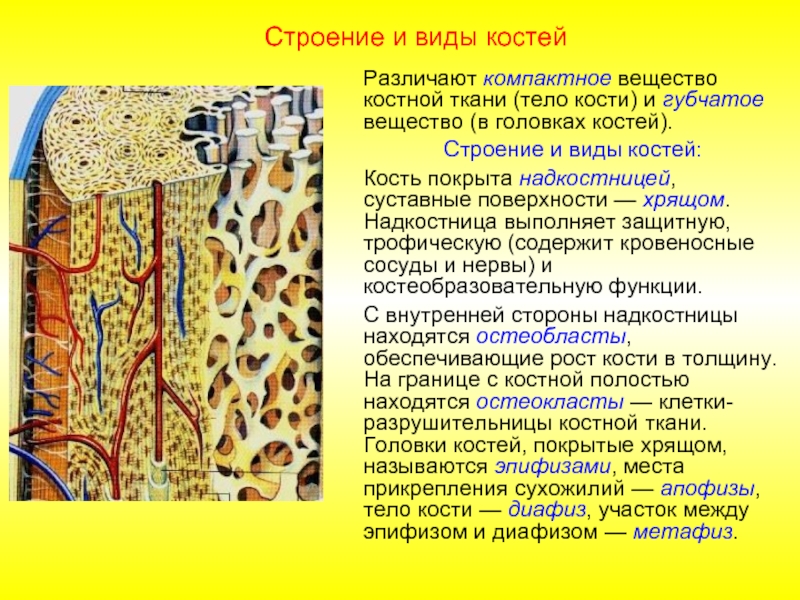 С внутренней стороны надкостницы находятся остеобласты, обеспечивающие рост кости в толщину. На границе с костной полостью находятся остеокласты — клетки-разрушительницы костной ткани. Головки костей, покрытые хрящом, называются эпифизами, места прикрепления сухожилий — апофизы, тело кости — диафиз, участок между эпифизом и диафизом — метафиз.