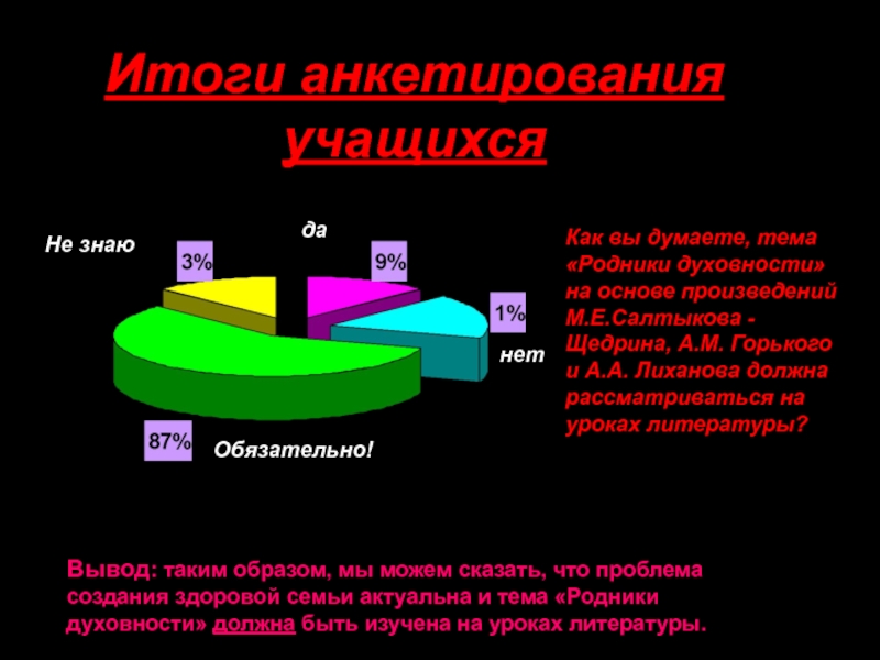 Вывод: таким образом, мы можем сказать, что проблема создания здоровой семьи актуальна и тема «Родники духовности» должна быть изучена на уроках литературы.